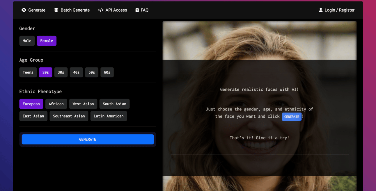 Face Studio generates realistic human faces using AI. Select the gender, age group and ethnic features you’d like to see and the AI will generate a lifelike human face for you.