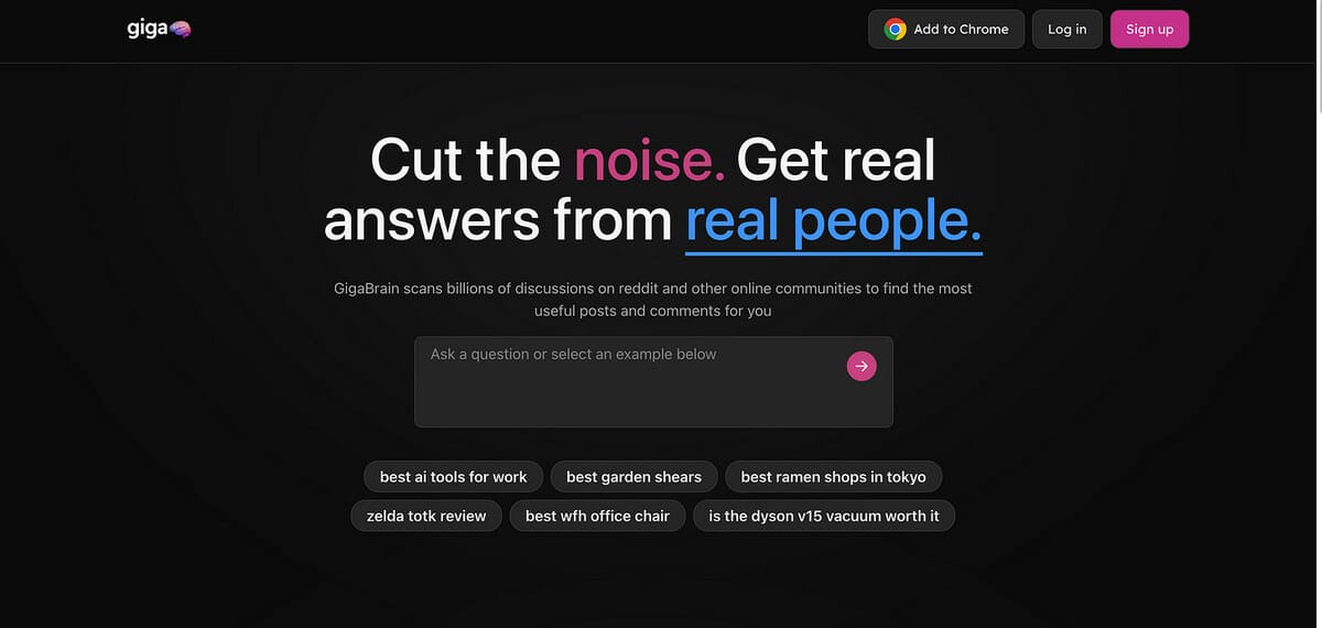 GigaBrain is a search engine that scans billions of discussions on Reddit and other online communities to find the most useful answers to your questions.