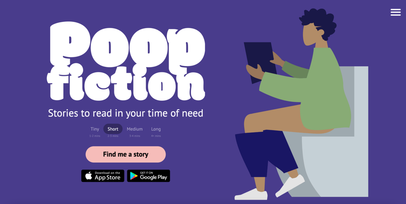 Poop Fiction is a fun website that gives you something to read when you're doing a 💩. Choose between a tiny, short, medium or long story (4mins +).