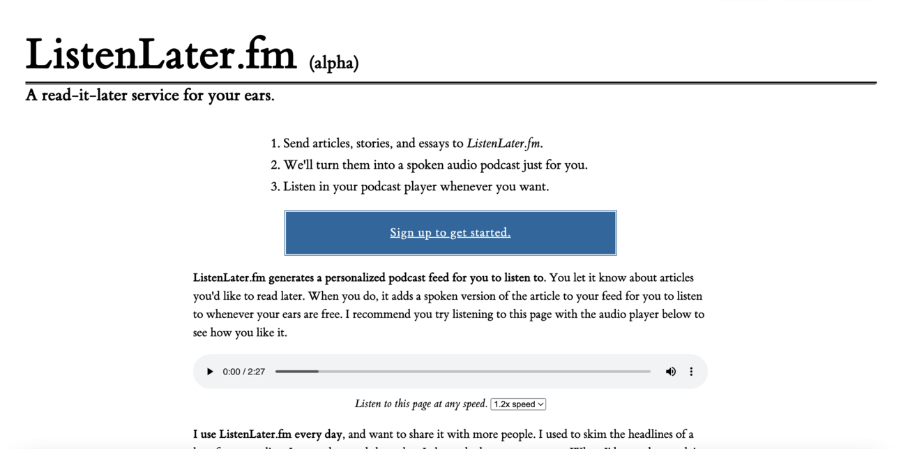 ListenLater.fm is a read-it-later service that generates a personalised podcast feed for you to listen to. Send it your articles, stories and essays and it turns them into a spoken audio podcast that you can listen to.