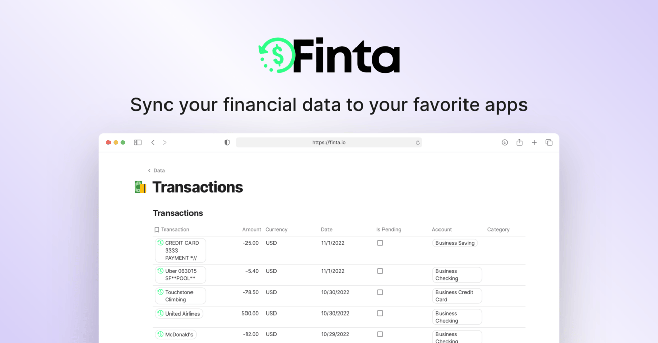 Finta automatically syncs your account balances, transactions, and investments to Notion, Coda, Sheets and Airtable. Now, you can manage your personal or company finances how you want, where you want.