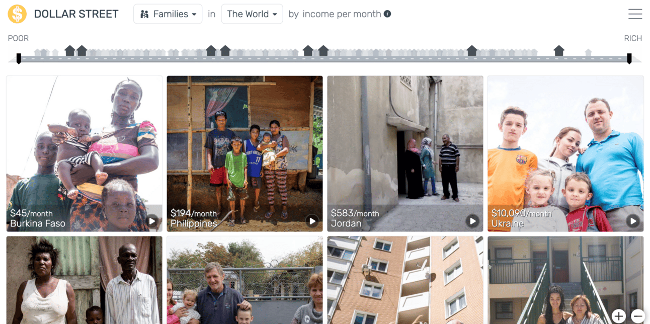 Dollar Street uses photos as data to make everyday life on different income all over the World easy to understand. It features 300+ homes from 52 countries ordered by income. The poorest live on one end, and the richest live on the other end.