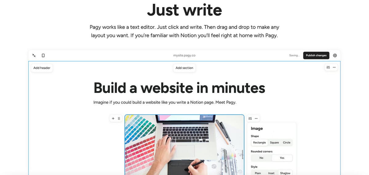 Pagy is a cool website builder that works just like Notion or any text editor. Just click and write, then drag and drop elements to make any layout you want.