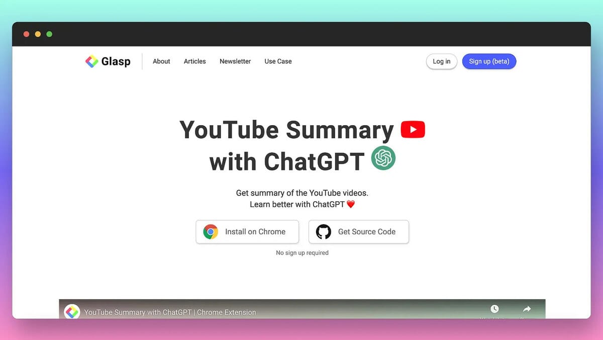 Glasp is a powerful chrome extension that lets you generate text summaries of any Youtube video using ChatGPT AI.