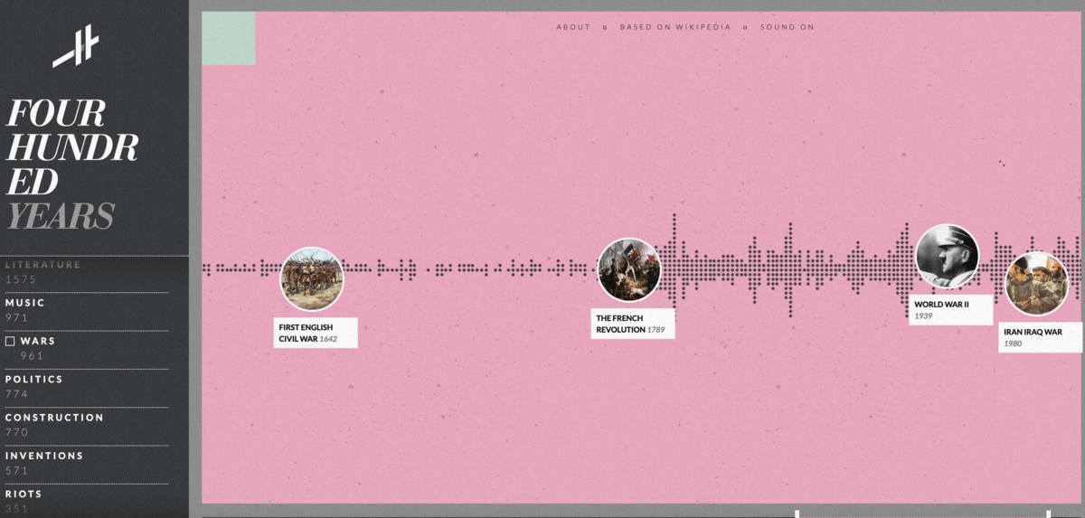 Histography is a cool website that visualises key historical events (according to Wikipedia) as an accumulation of dots. Use the categories on the left to filter events or resize the bottom bar to change time periods.