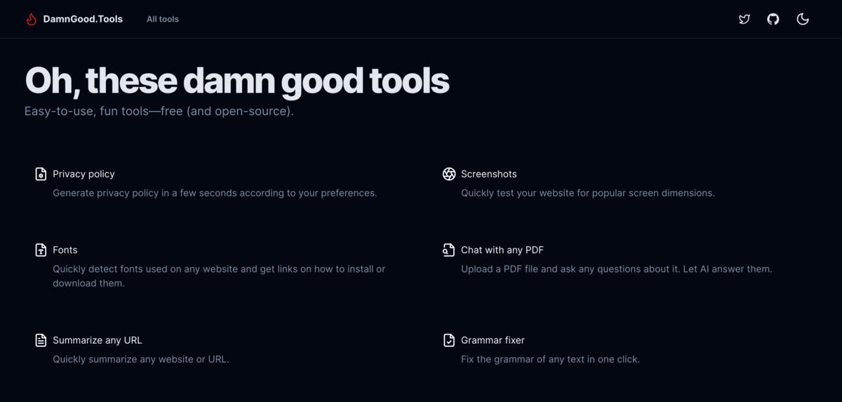 Damn Good Tools features easy-to-use, fun productivity tools - completely free and open-source. Use this website to chat with any PDF, summarize any website or URL, or fix the grammar of any text in one click.