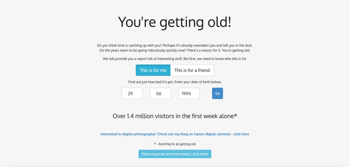Do you feel like time is catching up with you? This quirky website puts your age in a demoralisingly frank perspective by showing you all the stuff that has happened since you were born.